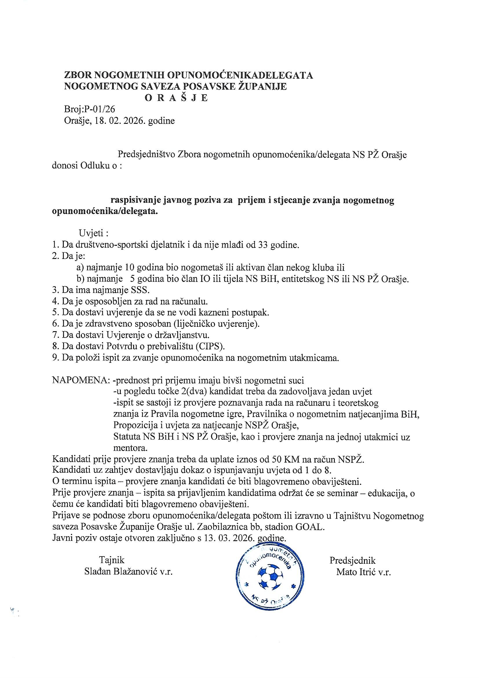 - Odluka o raspisivanju javnog poziva za prijem i stjecanje zvanja nogometnog opunomoćenika/delegata